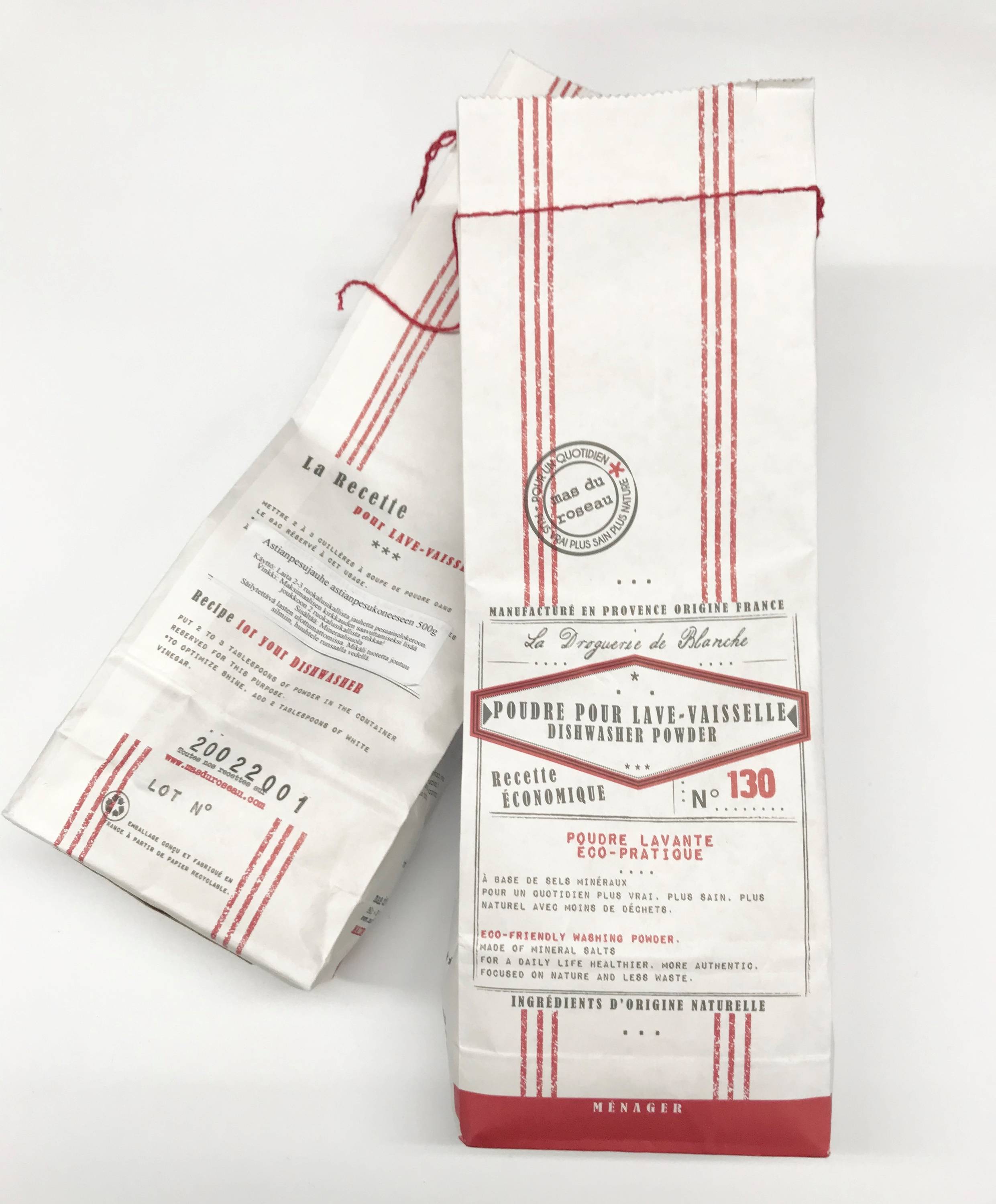 Tuoksuton konetiskiaine 500 gramman paperipussissa. Laita muutama ruokalusikallinen pesujauhetta pesuainelokeroon ja laita kone päälle. Sisältää erilaisia suoloja. Valmistettu Ranskassa.
