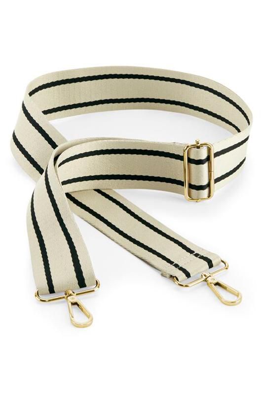 Vaalean beigen värinen olkahihna jossa on mustat raitatehosteet ja kullanväriset metalliosat. Pituus 127 cm ja leveys 5 cm.