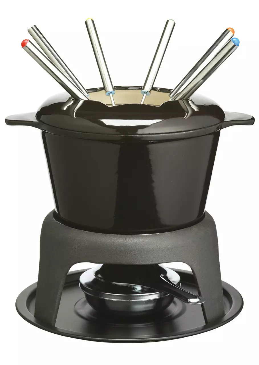 Tyylikäs emaloitu valurautainen fonduesetti soveltuu sekä juusto-, liha että suklaafonduelle. Ihana tapa viettää iltaa ystävien kanssa. Paketissa on 6 kpl fonduehaarukoita värikoodein sekä poltin jossa voit käyttää polttonestettä tai geeliä.
