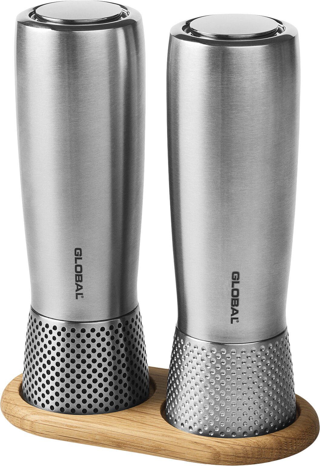 Global -tuotemerkin teräksinen suola- ja pippurimylly sekä puinen alusta.