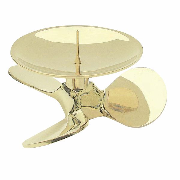 Merellinen kynttilänjalka messinkiä. Kynttilän alusta tukipiikkeineen lepää potkurin päällä.