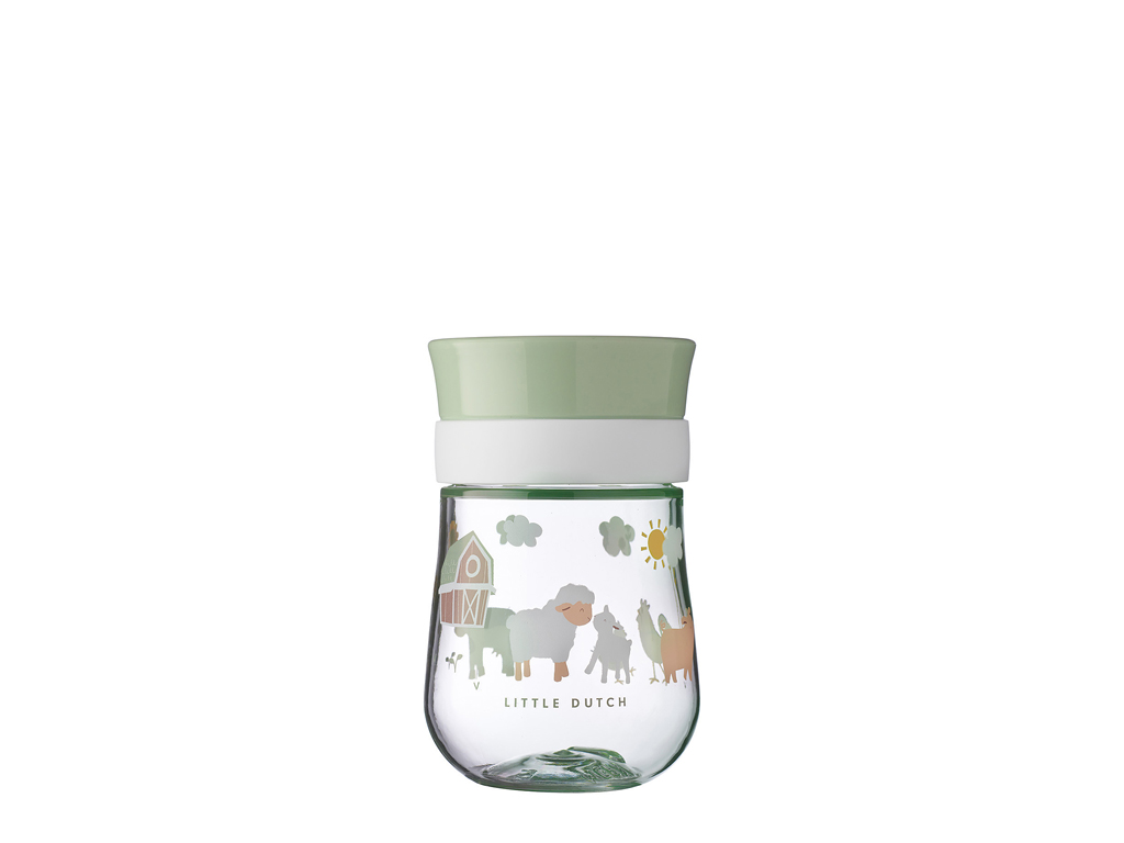 Lapselle joka opettelee juomaan lasista. Kätevä muki josta voi juoda 360° ja kansi ei päästä kaikkea kerralla.