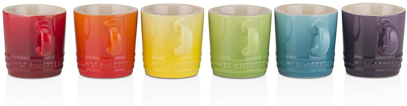 Malli on täysin sama kuin isompienkien Le Creuset mukien, mutta koko on juuri passeli espressolle, tiukalle glögille tai herkulliselle jälkiruualle. Voisihan näistä tarjota myös vaikka dippikastikkeita. Materiaali on kivikeramiikkaa, jonka voit pestä astianpesukoneessa, laittaa mikroon ja vaikka uuniin. Vältä kuitenkin äkkinäisiä lämmönvaihteluita esimerkiksi suoraa pakkasesta uuniin. Yhdessä paketissa on yksi kuppi kutakin väriä: punainen, oranssi, keltainen, vihreä, sininen ja violetti. Kupeissa toistuu sama liukuvärjäys kuin muissa Le Creuset'n tuotteissa, kuten padoissa.