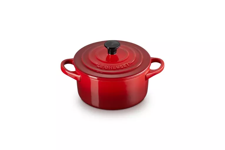 Punainen ihana pikkupata jossa on ikoniset Le Creuset -renkaat kannessa, kuten perinteikkäillä emaloiduilla valurautapadoillakin.