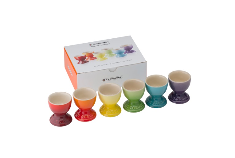 Kata upea aamupala sateenkaaren väreissä. Paketissa on kuusi tukevaa munakuppia, jotka ovat Le Creuset'n laadukasta keramiikkaa. Yhdessä paketissa on kutakin väriä yksi munakuppi: punainen, oranssi, keltainen, vihreä, sininen ja violetti. Munakupeissa toistuu sama liukuvärjäys kuin Le Creuset'n padoissa, eli ne ovat alhaalta tummempia ja vaalenevat yläreunaa kohti. Munakupit saa pestä astianpesukoneessa. Ne kestävät jopa pakastimen ja uunin.