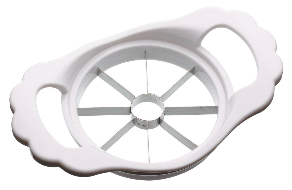 Lohkoo omenan ja irrottaa samalla karan. Varo sormia, laita omena pystyyn ja paina alas kahvoista.