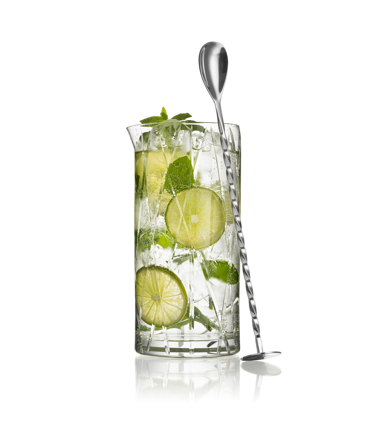 Baarimestarille kristallinen sekoituslasi sekä baarilusikka! Vetoisuus 65 cl. Design Martti Rytkönen.