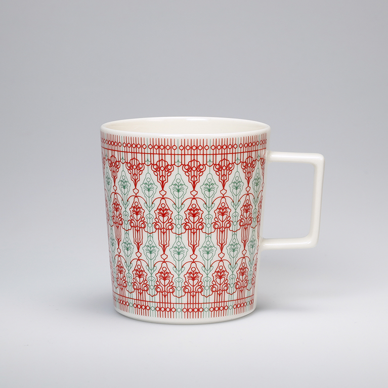 Posliininen Suomen Porvoossa valmistettu muki jossa on kädensija josta on mukava pitää kiinni.