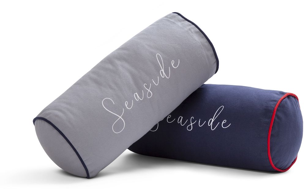 Merihenkiseen sisustukseen sopiva Seaside-koristetyyny. Tyynyn pituus noin 45 cm, halkaisija noin 20 cm.