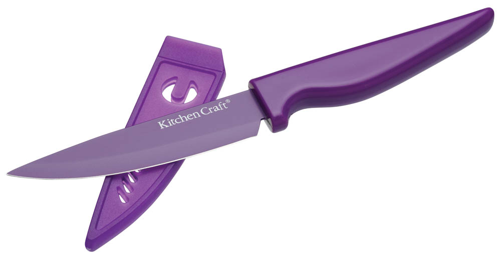 Näppärä yleisveitsi esimerkiksi hedelmien kuorimiseen ja siivuttamiseen. Terän pituus on n 10 cm, samoin kahvan. Terä on ruostumatonta terästä ja päällystetty tarttumattomalla pinnoitteella. Kätevä suojus pitää terän suojassa jos säilytät veitsiä laatikossa. Sopii myös hienosti picnic- koriin ja matkalle mukaan ( paitsi lentokoneen käsimatkatavaroihin). Valitse sinulle mieluinen väri!